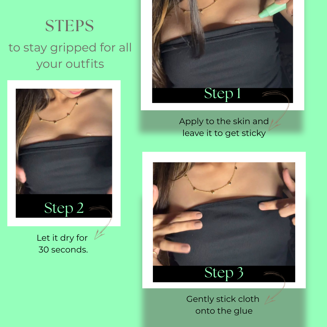 This dermatologically tested, sweat-resistant formula grips gently to your skin and fabric without leaving behind residue or discomfort. Say goodbye to wardrobe malfunctions, constant readjustments, and double-sided tape.